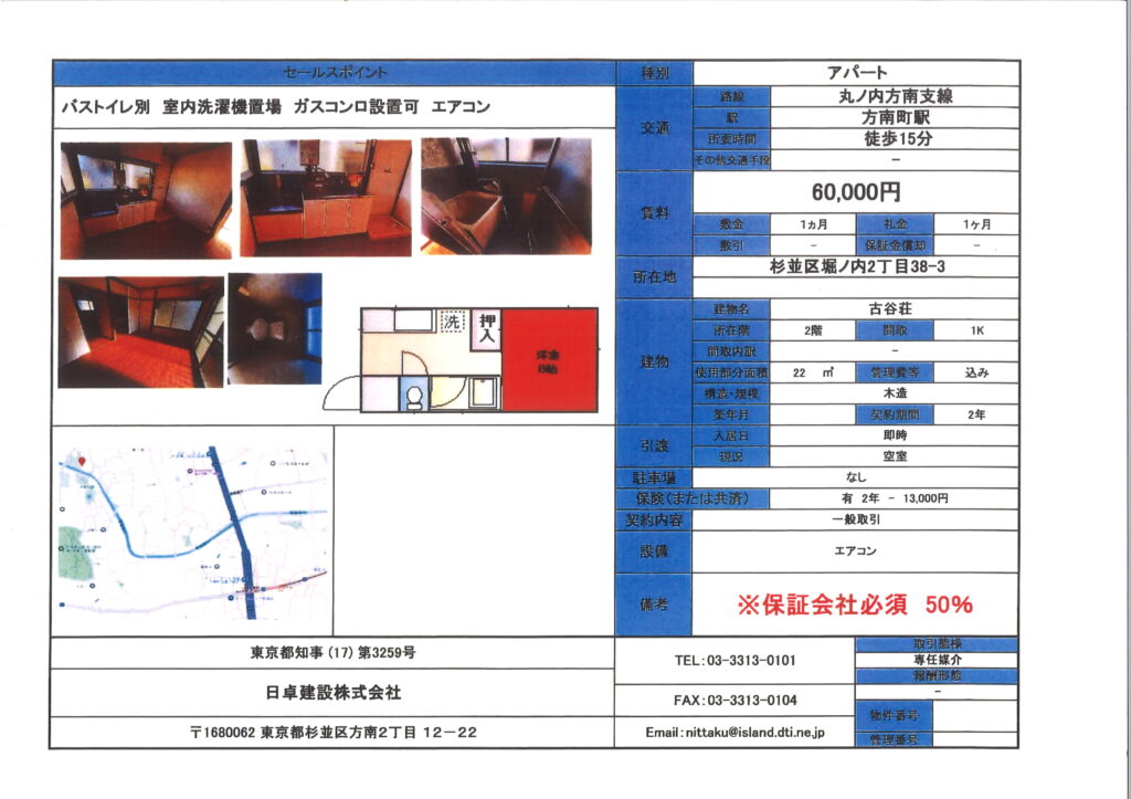 古谷荘 2Fnew 6万円 1K 22m² 物件の詳細を見る 賃料 6万円 アパート 間取1K 敷金1ヶ月 礼金1ヶ月 所在地 東京都杉並区 堀ノ内2丁目 古谷荘 交通 東京メトロ丸ノ内線 方南町駅 徒歩15分 築年月 構造 木造 階建 地上 2階 部屋階数 1階 面積 22m² 駐車場 部屋番号2 現況 空家 物件番号 1007 設備・条件 2人入居可 角部屋 エアコン 洗濯機置き場有