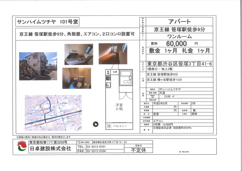 サンハイムツチヤ101号室up 6万円 1K 15.08m² 物件の詳細を見る 賃料 6万円 アパート 間取1K 敷金1ヶ月 礼金1ヶ月 更新料1ヶ月 所在地 東京都渋谷区 3丁目41-6 サンハイムツチヤ 交通 京王線 笹塚駅 徒歩9分 京王線 幡ヶ谷駅 徒歩15分 築年月 1993/08 構造 木造 階建 地上 2階 部屋階数 1階 面積 15.08m² 駐車場 部屋番号101 現況 空家 物件番号 1301 設備・条件 単身者限定 高齢者歓迎 ペット不可 角部屋 給湯 エアコン